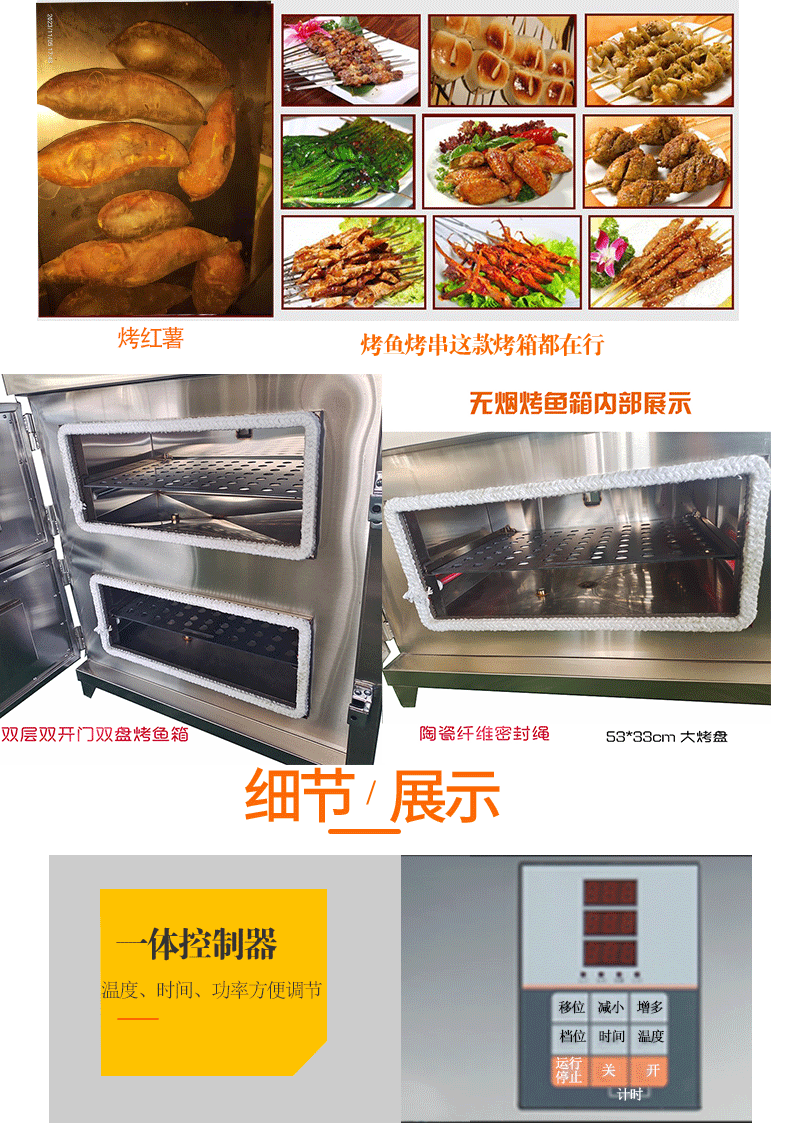 1.減少人工,320度恒溫烤制,避免人工操作的失誤,自動報警系統(tǒng),減少專門負責烤魚的操作人員/避免人為因素產生的烤制效果